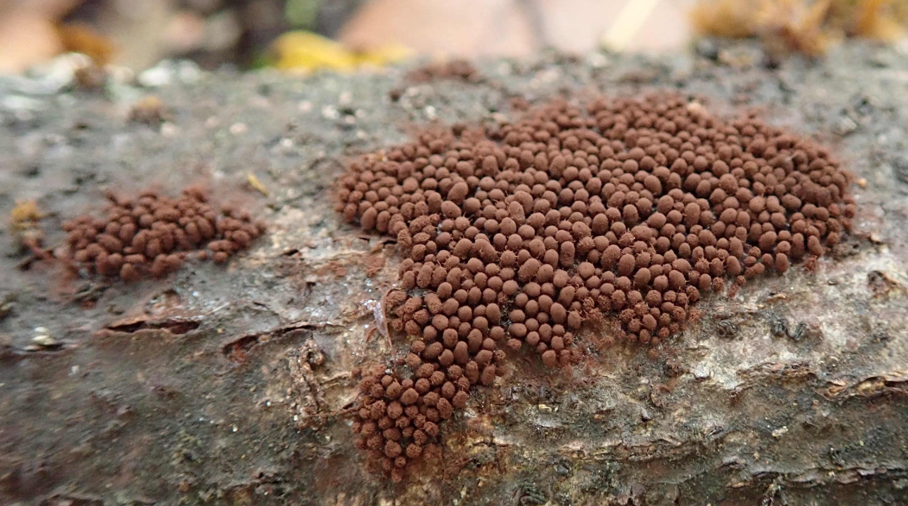 Sporocarpes : densément groupés, dressés (quelques exemplaires inclinés), 2,2 mm de hauteur totale.
