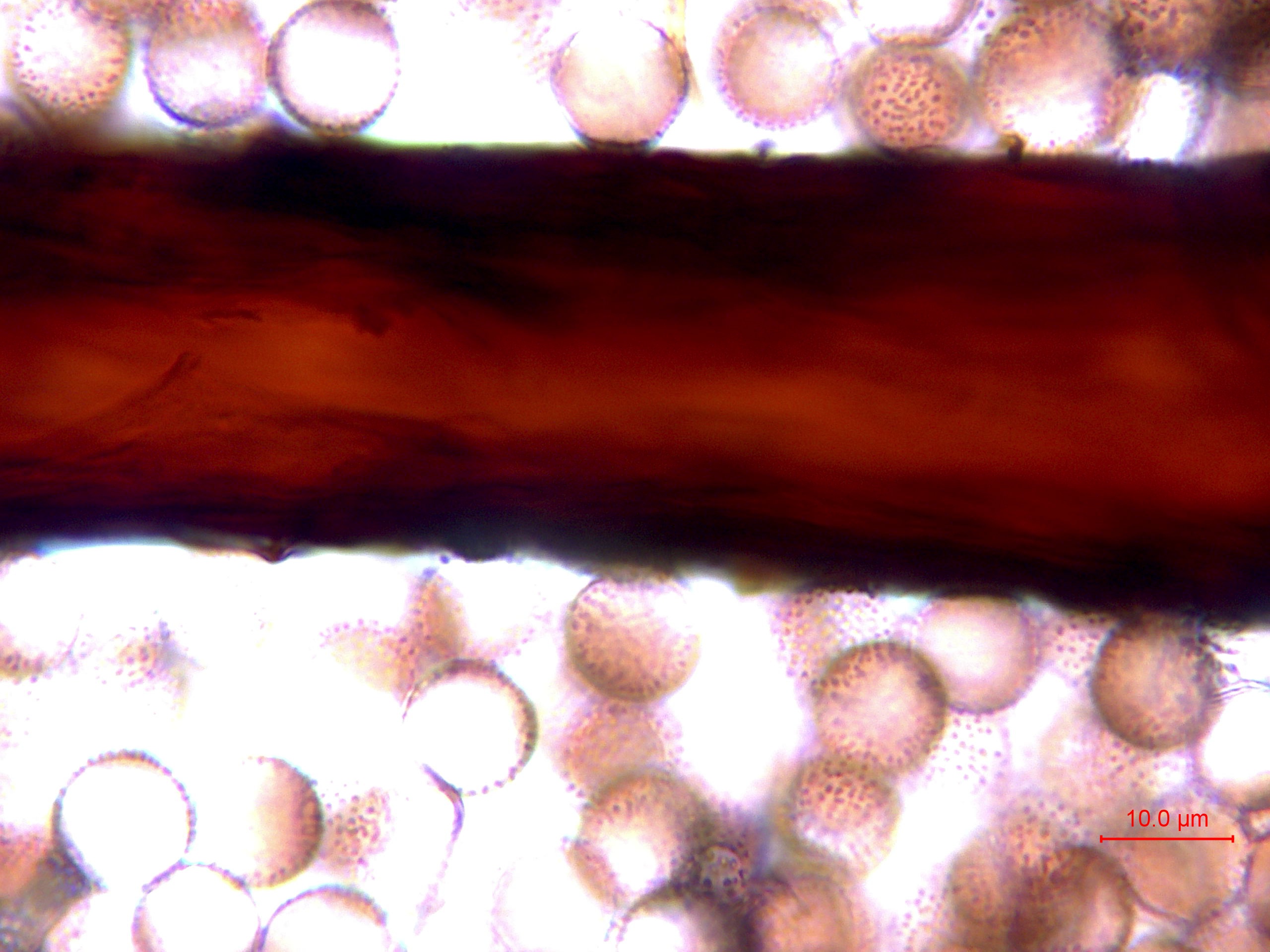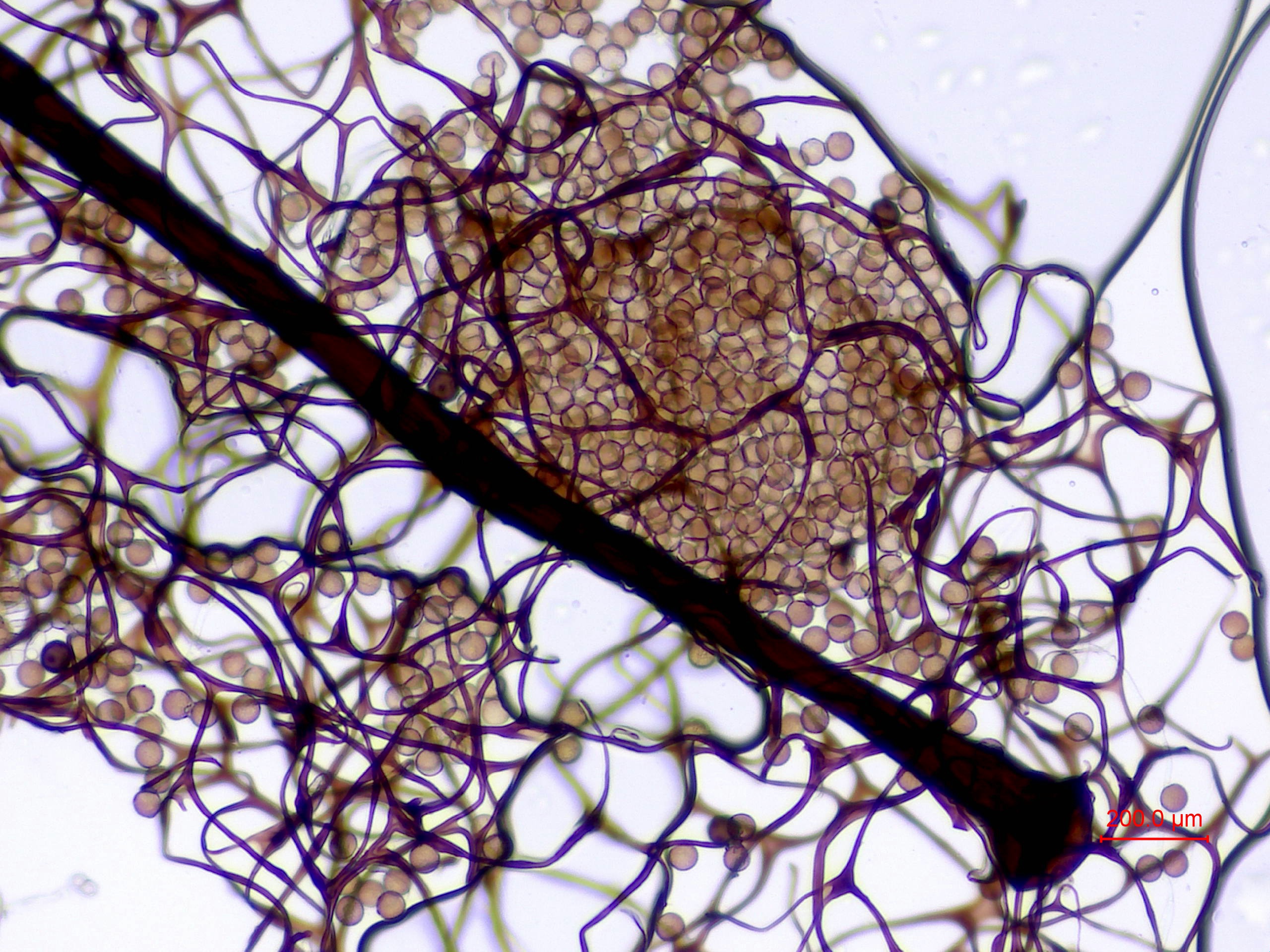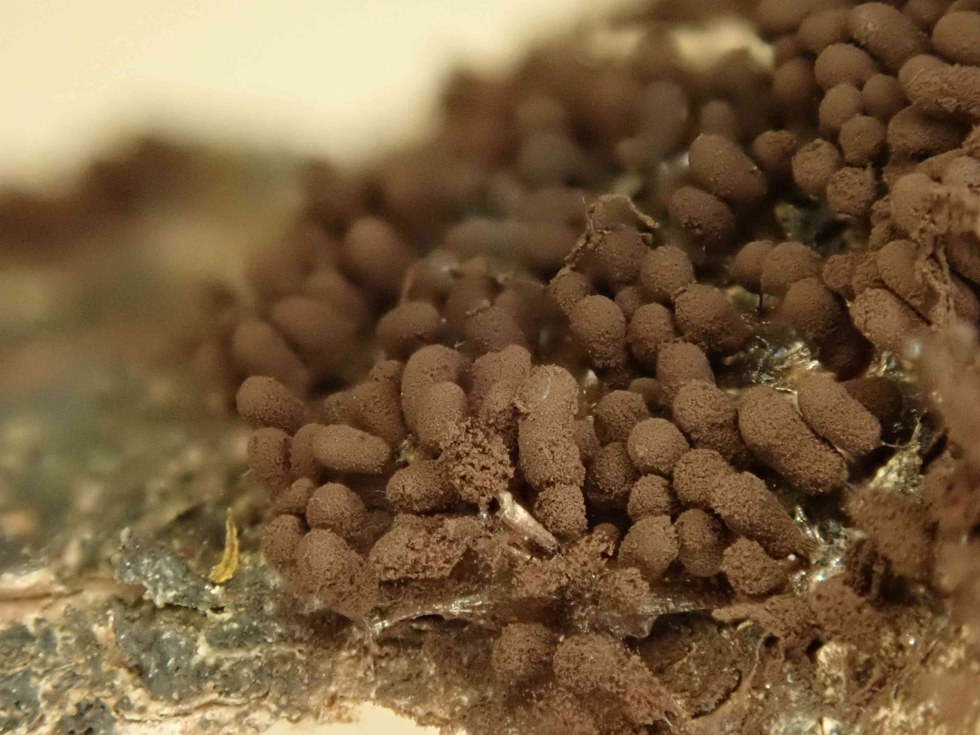 Sporocystes : bruns, plus foncés en séchant, 2/3 de la hauteur totale, arrondis à la base et au sommet.