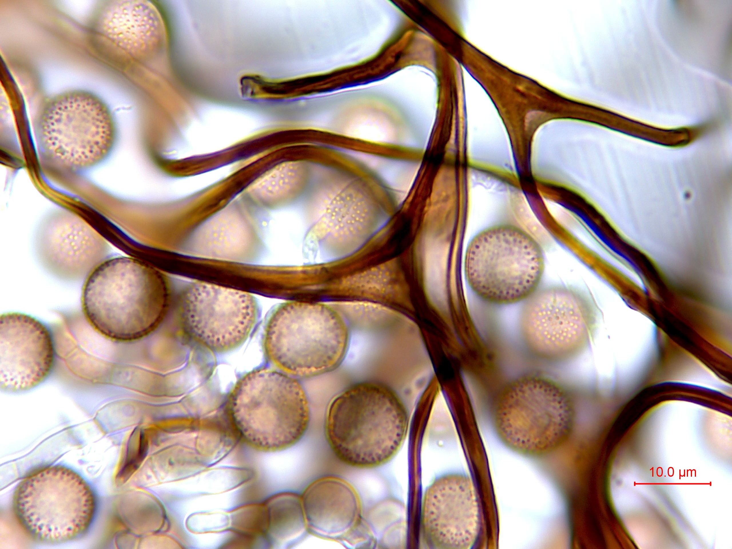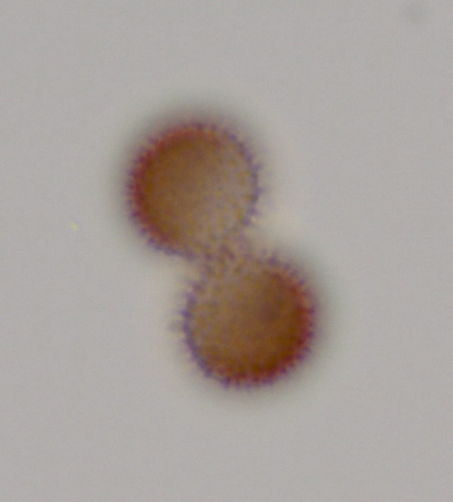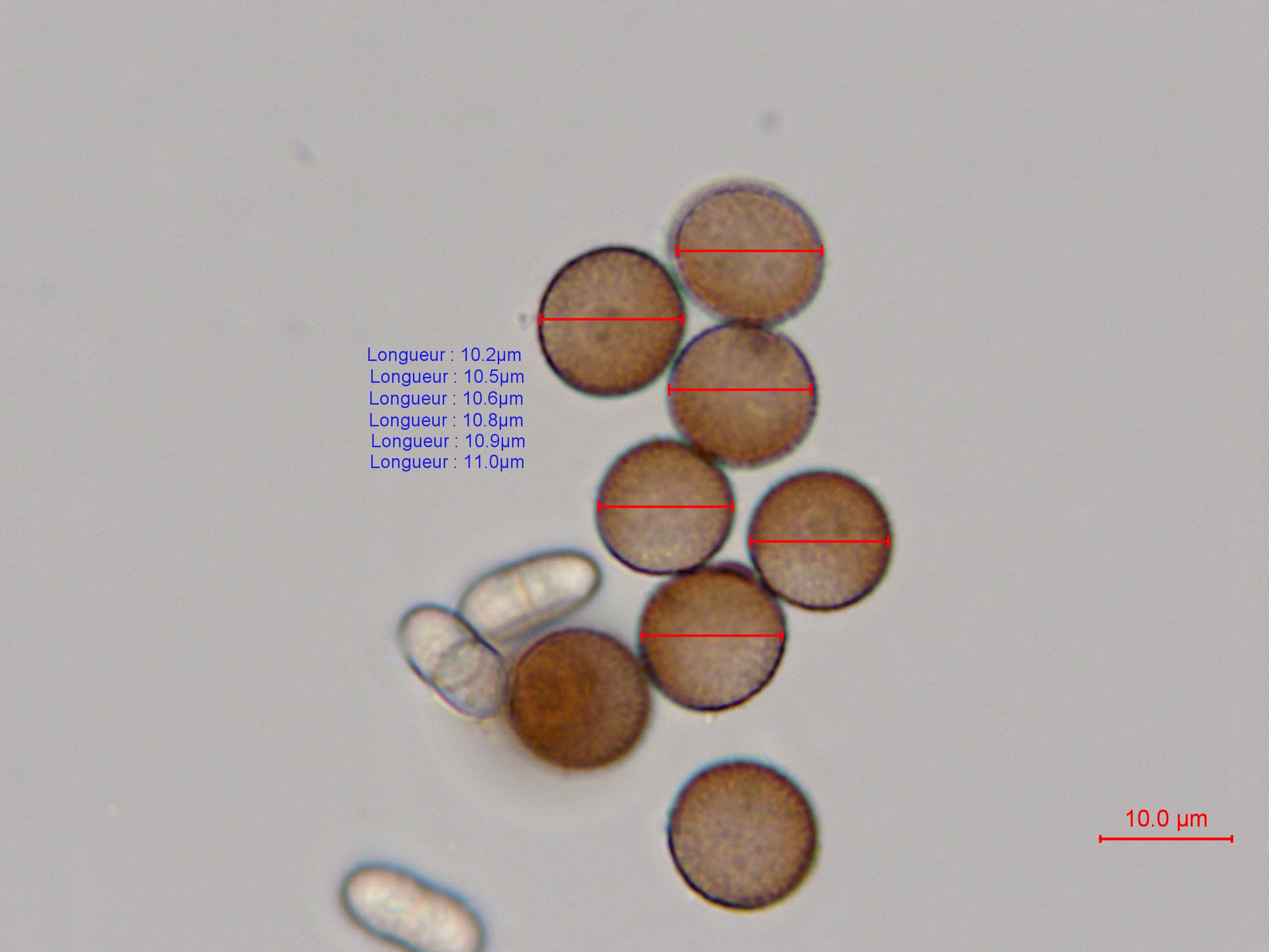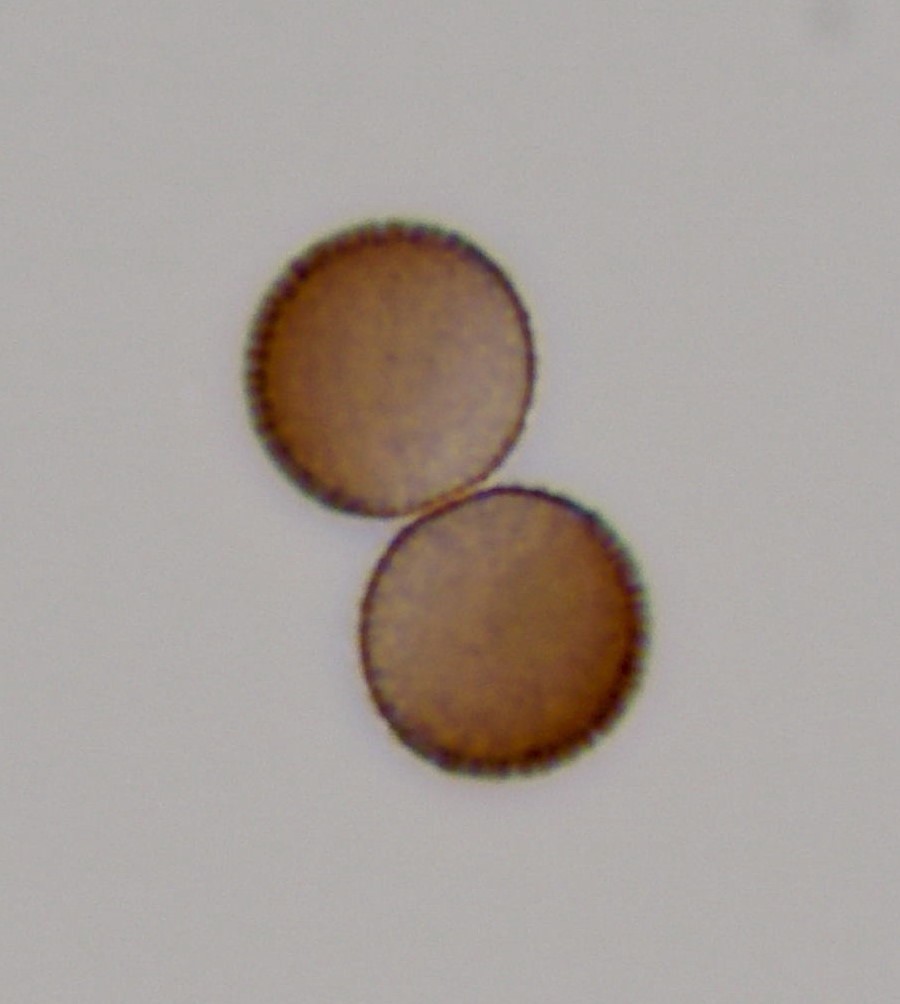 Spores : sporée en masse brune ; moyennement foncées en lumière transmise, avec une zone plus claire au contour mal défini ; globuleuses, ornées de spinules.