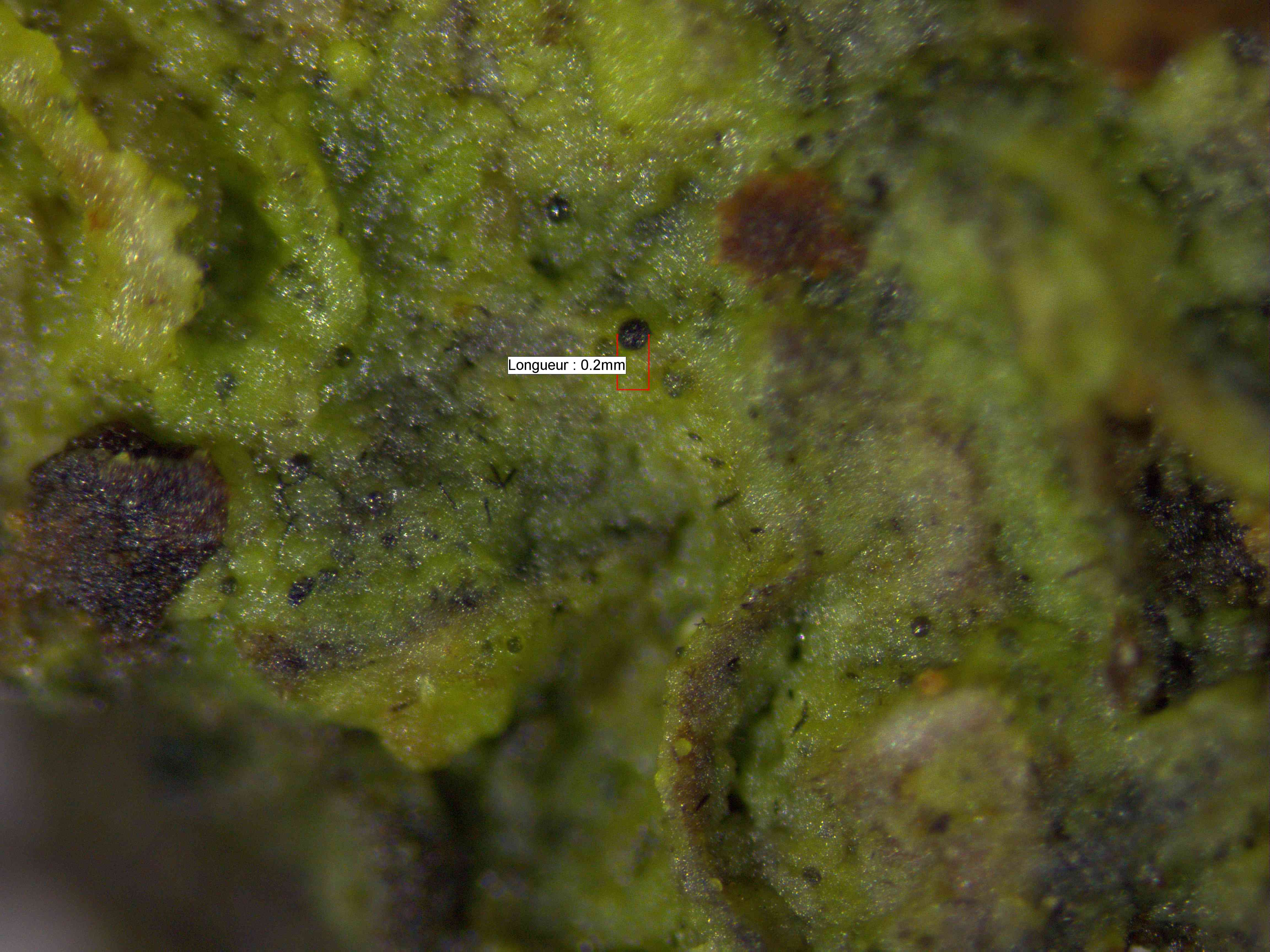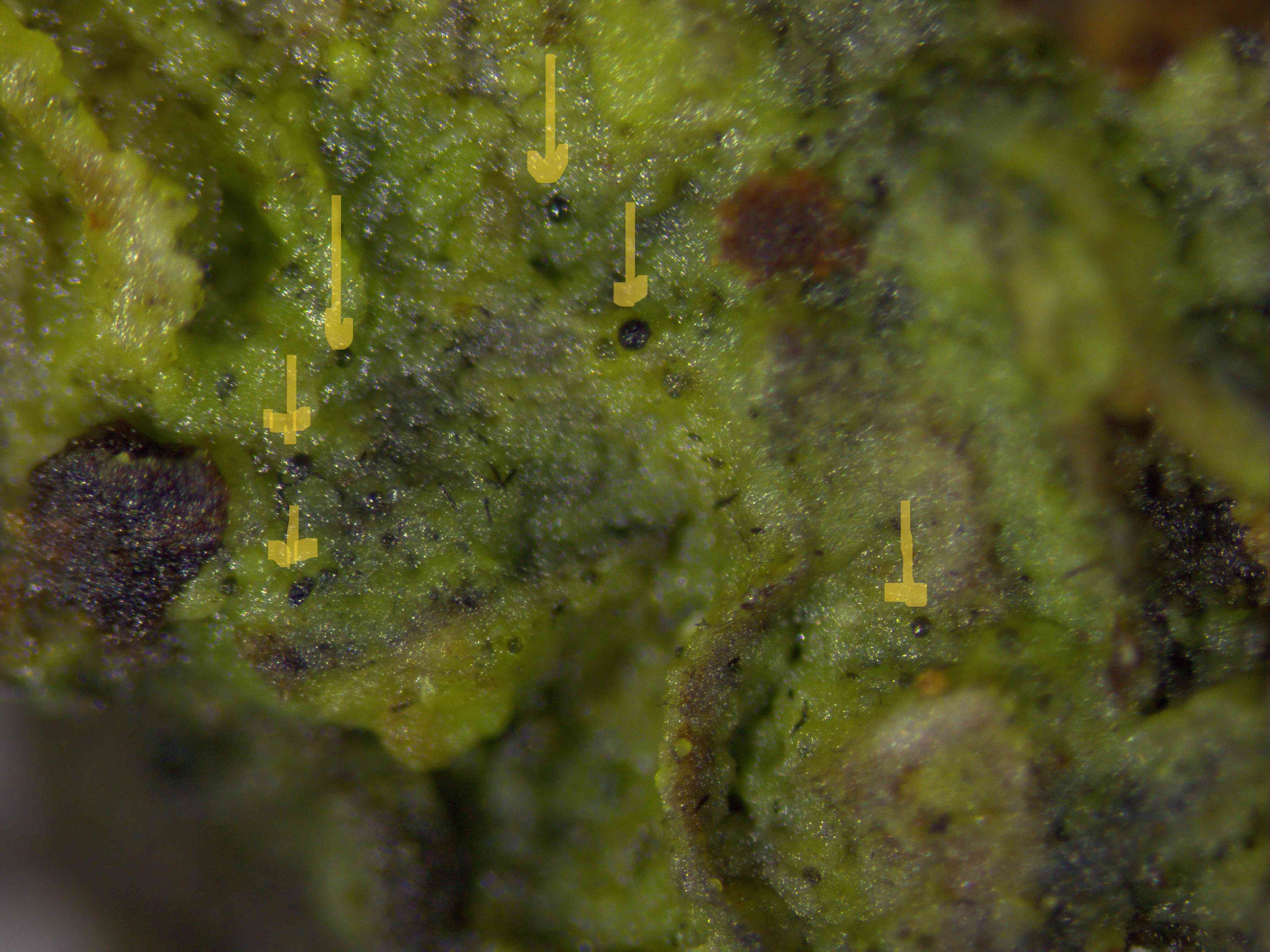 Sporocarpes de 0,2 à 0,6 mm, nombreux mais disséminés, noirs, luisants si humides, mats quand ils sont secs.