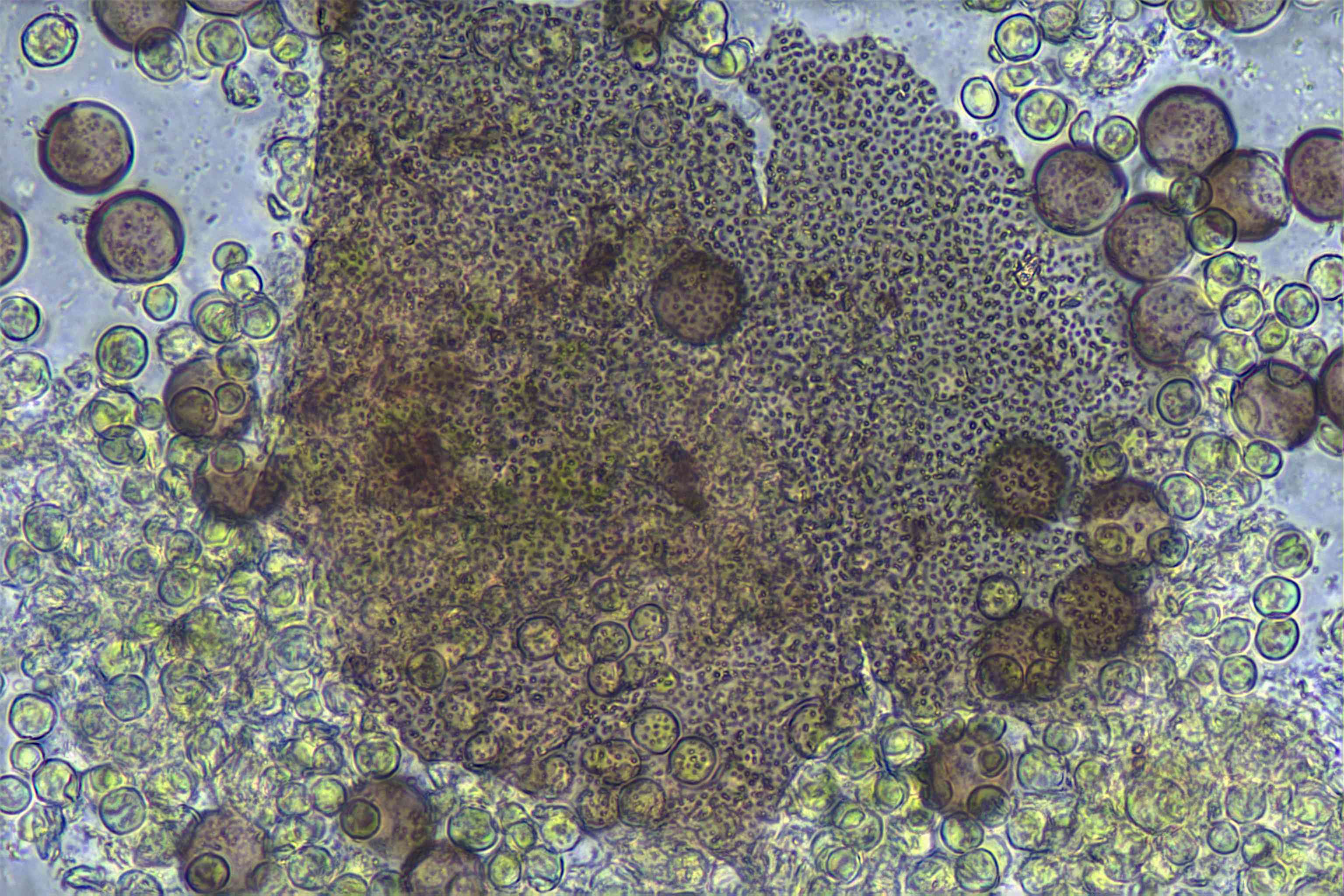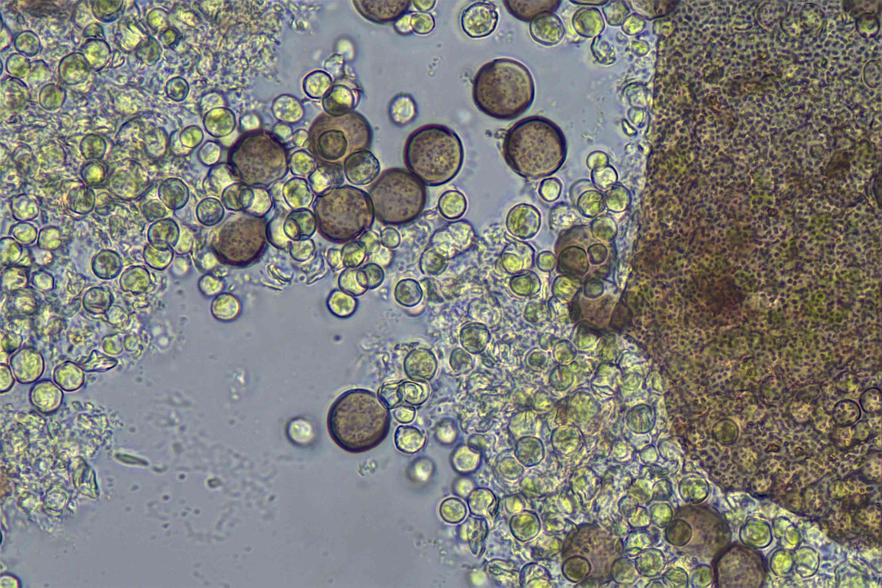 F : Péridium x 1000. Egalement des spores et des algues unicellulaires (cellules vertes).