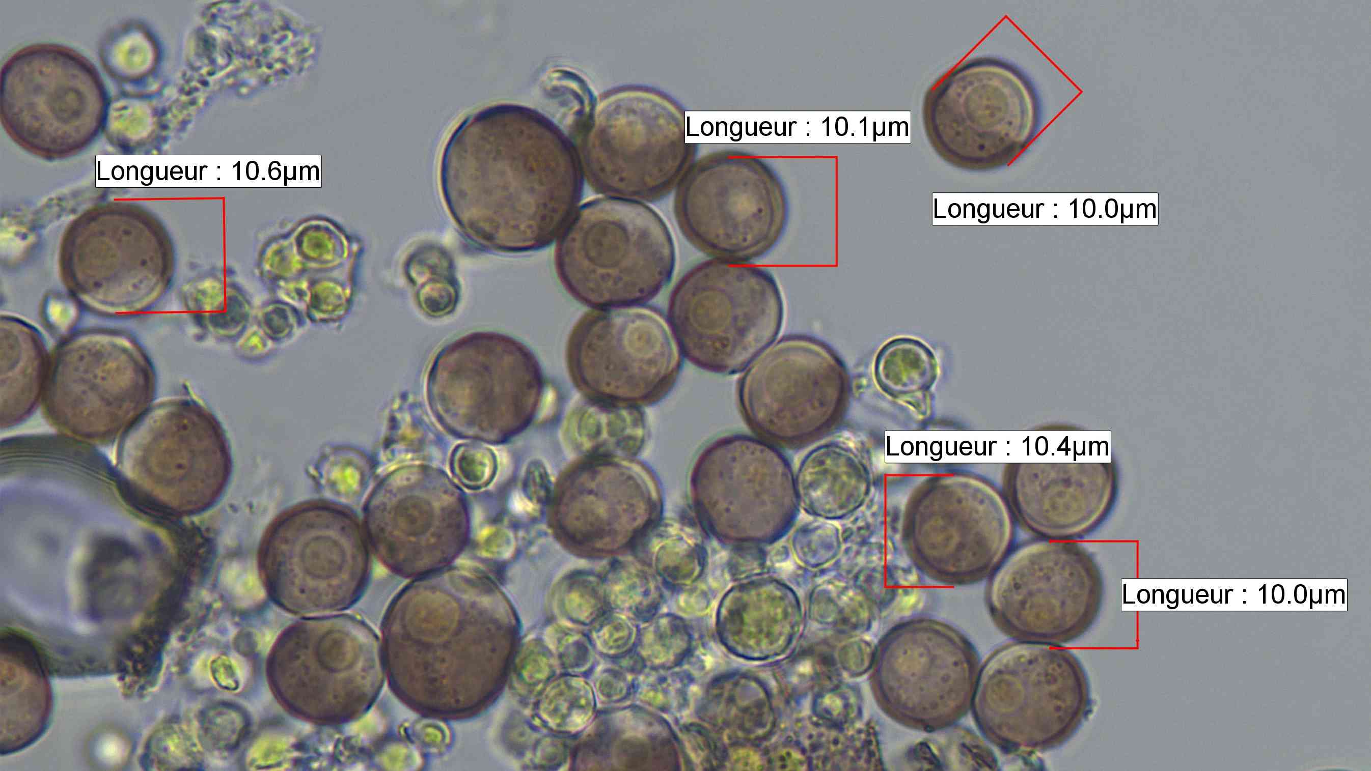 Spores :10 à 11 µm, brun moyennement foncé avec une zone plus claire correspondant à un pore germinatif, à paroi épaisse mais amincie sur la zone éclaircie (G et H).